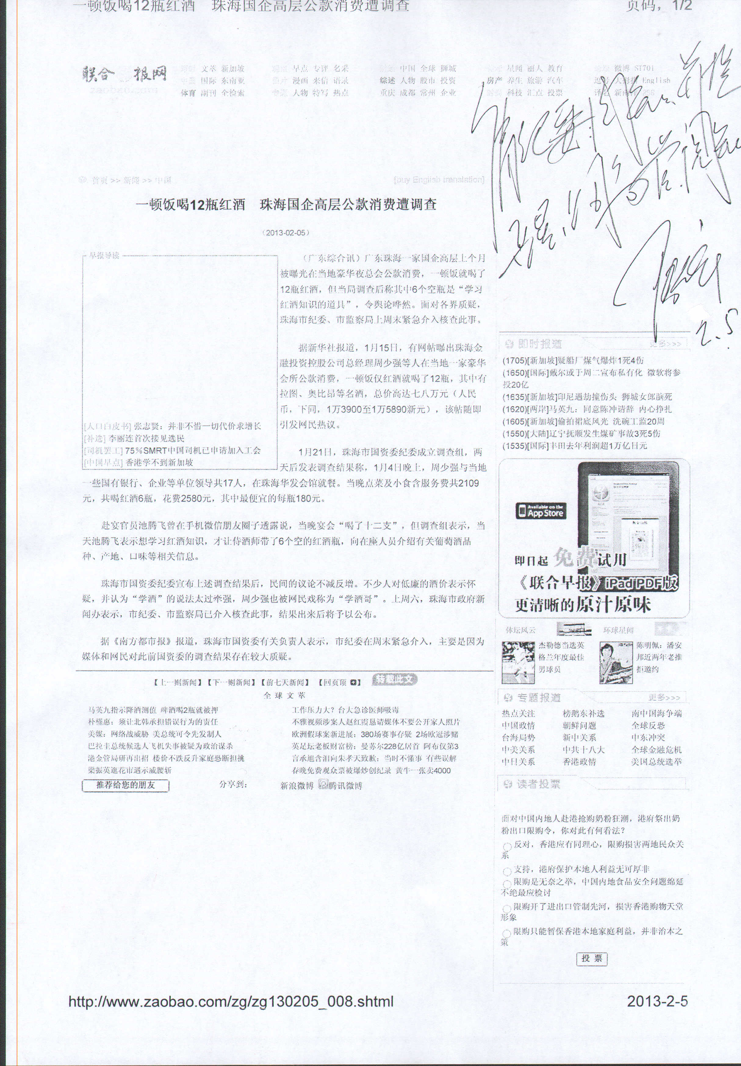 陸金龍董事長對網載“珠海國企高層公款消費”作出批示,提醒公司高管引以為戒2月5日聯合早報網...