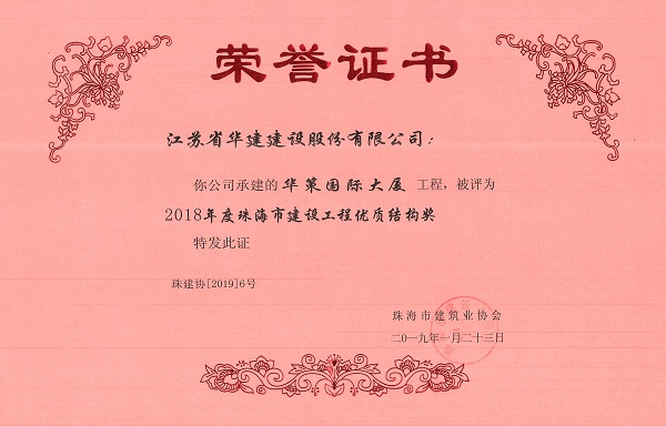 華策國(guó)際大廈獲2018年度珠海市建設(shè)工程優(yōu)質(zhì)結(jié)構(gòu)獎(jiǎng)