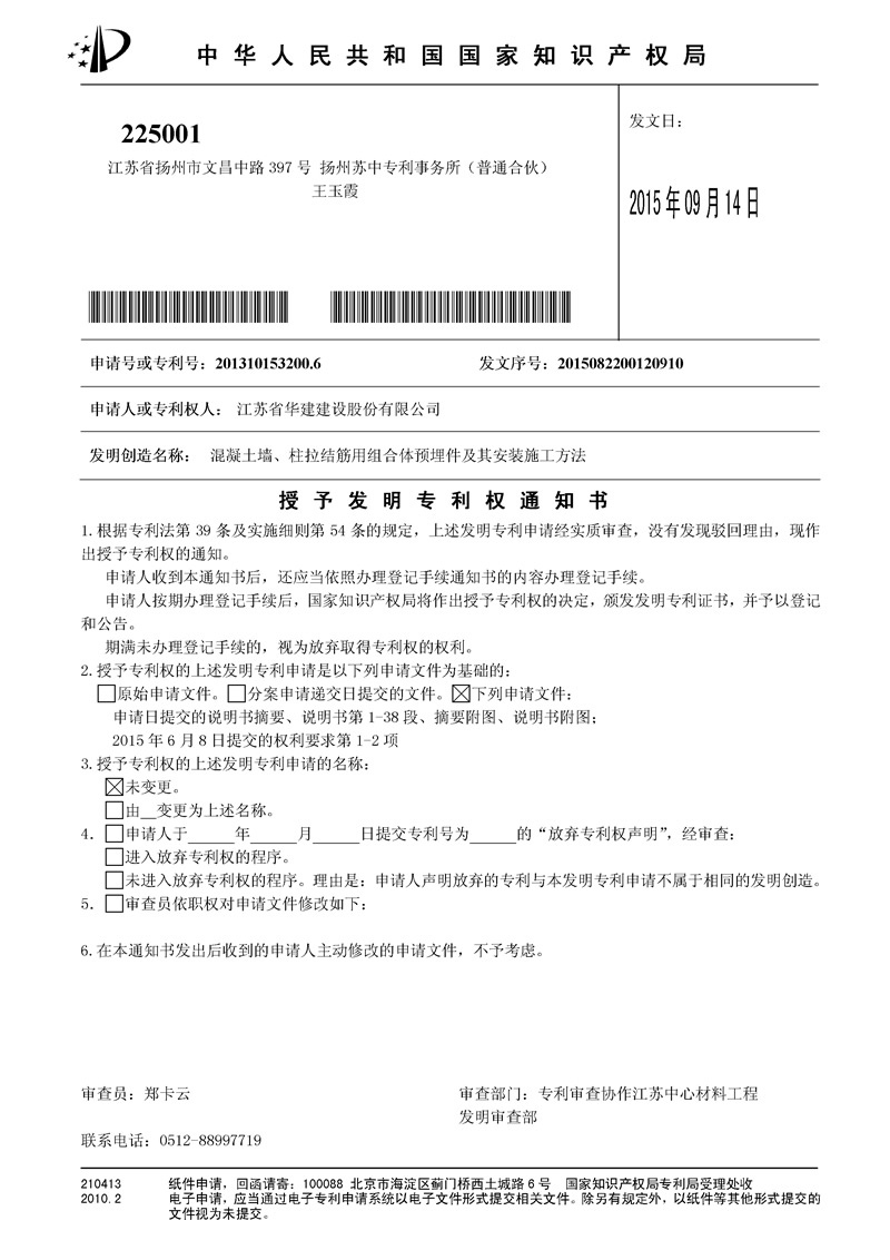 公司獲一項發明專利 時間:2015-09-15 6058 日前,江蘇華建上海區域公司發布的《混凝土墻、柱拉結筋用組合體預埋件及其安裝施工方法》發明創造被國家知識產權局授予“發明專利權”,專利號:201310153200.6。