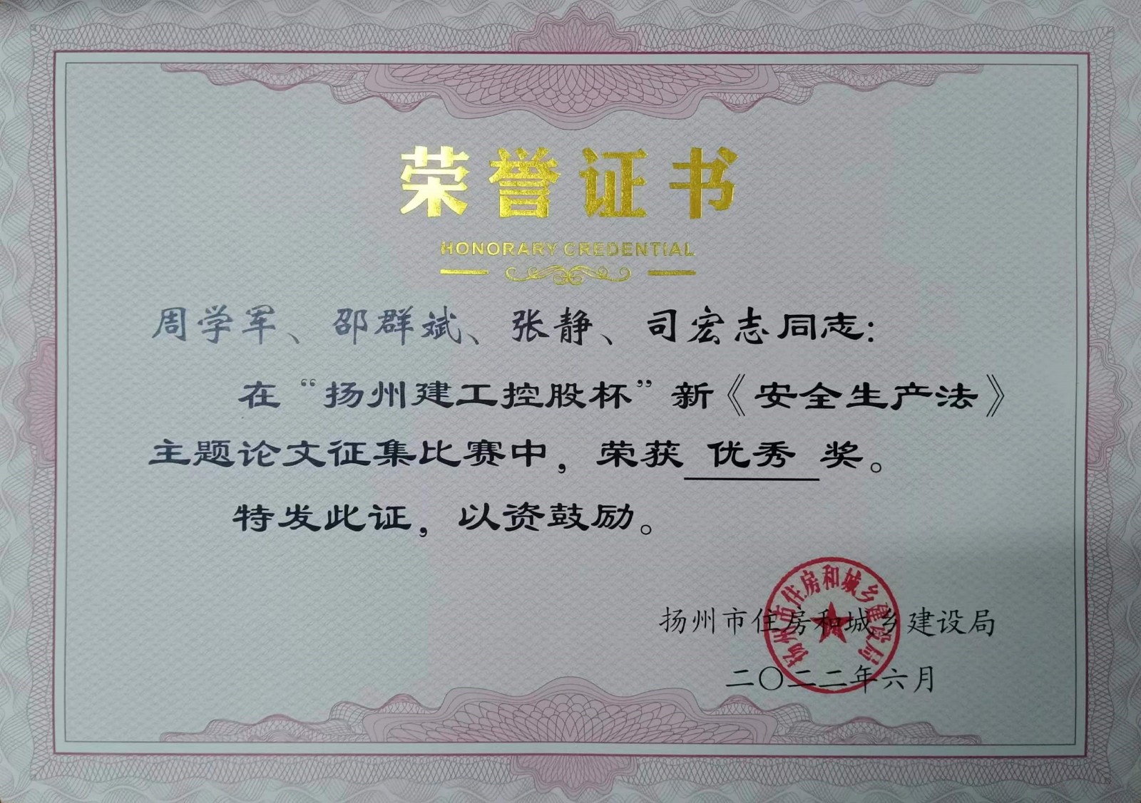 北京分公司4篇論文獲揚州市新《安全生產法》主題論文征文比賽獎項 時間:2022-07-16 4272 近日,從揚州市住房和城鄉建設局傳來喜訊,由北京公司投稿的4篇論文榮獲“揚州建工控股杯”新《安全生產法》主題論文征文比賽獎項,并獲頒證書,其中一等獎一項,三等獎一項,優秀論文獎兩項。