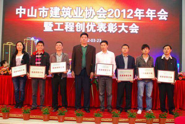 龍灣花園一期項目榮獲“中山市安全生產文明施工優良樣板工地”稱號 時間:2012-04-11 5423 龍灣花園一期項目榮獲“中山市安全生產文明施工優良樣板工地”稱號 2012年3月23日,中山市建筑業協會召開了“2012年年會暨工程創優表彰大會”。與會501家會員單位中,共有25個項目獲得了“中山市建設工程安全生產文明施工優良樣板工地”稱號,由珠海區域公司中山分公司施工的“龍灣花園一期”工程項目榜上有名。 珠海區域公司中山分公司總經理嚴正濤(右一)在表彰會現場領取獎牌