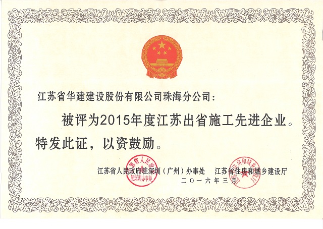 公司被評為“2015年度江蘇出省施工先進企業” 時間:2016-03-30 3613 3月24日,江蘇省人民政府駐深圳(廣州)辦事處和江蘇省住房和城鄉建設廳在廣西南寧召開2016年度江蘇建筑業南方區工作會議,珠海公司被表彰為“2015年度江蘇出省施工先進企業”,公司副總經理、總會計師馮喜平榮獲“江蘇出省施工優秀企業經理”稱號,公司副總經理、總工程師周學軍榮獲“江蘇省出省施工優秀建造師”稱號;徐平、陳榮被評為“江蘇省進粵、桂、閩、瓊施工質量安全先進個人”;趙永濤被評為“江蘇省進粵、桂、閩、瓊施工經營財務先進個人”。