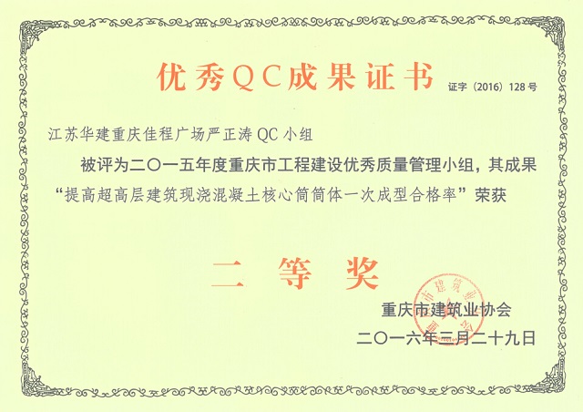 公司新增2項省級QC成果 時間:2016-04-06 4504 近日,重慶市建筑業協會發文表彰了一批優秀QC成果,公司重慶佳程廣場項目嚴正濤、沈正祥QC小組被評為2015年度重慶市工程建設優秀質量管理小組,其成果“提高超高層建筑現澆混凝土核心筒筒體一次成型合格率”、“提高鋼筋機械套筒連接合格率”等均榮獲二等獎。