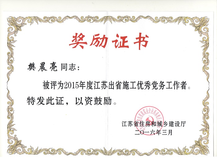 重慶分公司被表彰為“2015年度江蘇出省施工先進企業(yè)” 時間:2016-04-20 3171 近日,重慶分公司被江蘇省住房和城鄉(xiāng)建設(shè)廳表彰為“2015年度江蘇出省施工先進企業(yè)”,重慶分公司總經(jīng)理嚴正濤榮獲“2015年度江蘇出省施工優(yōu)秀企業(yè)經(jīng)理”稱號,樊晨亮被評為“2015年度出省施工優(yōu)秀黨務(wù)工作者”。