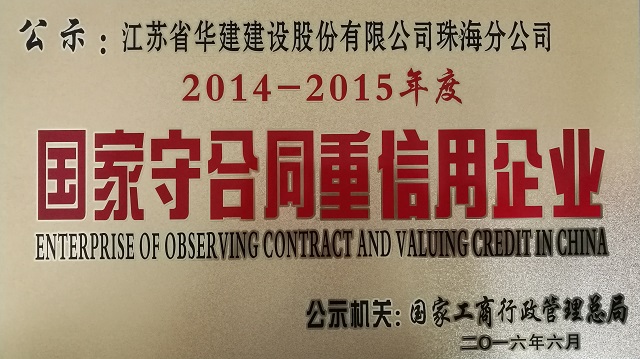 公司榮獲國家級“守合同重信用”企業稱號 時間:2016-08-02 3099 日前,國家工商行政管理總局向社會公示2014-2015年度“守合同重信用”企業名單,珠海公司榮獲國家級“守合同重信用”企業稱號。 珠海市共計13家企業被國家工商總局表彰為2014-2015年度“守合同重信用”企業,其中新上榜企業4家。榮獲該稱號充分展現出江蘇華建在珠海市場守法履約的良好施工企業形象。