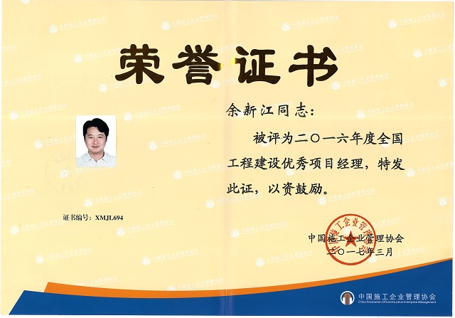 余新江榮獲“2016年度全國工程建設(shè)優(yōu)秀項(xiàng)目經(jīng)理” 時(shí)間:2017-04-24 3623 4月20日 ,中國施工企業(yè)管理協(xié)會(huì)第32次年會(huì)在廈門召開。會(huì)上,中施企協(xié)對(duì)全國優(yōu)秀項(xiàng)目經(jīng)理進(jìn)行了表彰,珠海分公司余新江同志被授予“2016年度全國工程建設(shè)優(yōu)秀項(xiàng)目經(jīng)理”稱號(hào)。