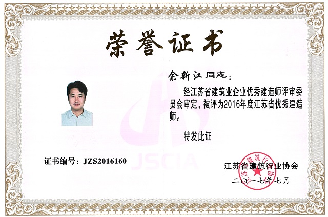公司1位同志被授予“江蘇省優(yōu)秀建造師”榮譽(yù)稱號(hào) 時(shí)間:2017-12-12 4300 日前,江蘇省建筑行業(yè)協(xié)會(huì)下發(fā)了《關(guān)于2016年度江蘇省建筑業(yè)優(yōu)秀建造師的決定》,公司余新江同志位列榜單,榮獲表彰,被授予“江蘇省優(yōu)秀建造師”榮譽(yù)稱號(hào)。