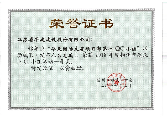 近期,揚(yáng)州市建筑行業(yè)協(xié)會(huì)公布了2018年度揚(yáng)州市工程建筑業(yè)優(yōu)秀QC小組活動(dòng)成果評(píng)比結(jié)果,公司共有9項(xiàng)成果受到表彰。其中,華策國(guó)際大廈項(xiàng)目部QC小組“設(shè)備機(jī)房減振降噪的創(chuàng)新方法”成果榮獲一等獎(jiǎng);華策國(guó)際大廈項(xiàng)目部QC小組“提高鋼結(jié)構(gòu)工程高強(qiáng)螺栓安裝合格率”、威麗詩花園一期QC小組“降低地下室主體結(jié)構(gòu)滲水率”和再生時(shí)代項(xiàng)目部QC小組“提高超高層空間鋼柱安裝精度”三篇成果榮獲二等獎(jiǎng);華策國(guó)際大廈項(xiàng)目部QC小組“提高輕質(zhì)隔墻板施工質(zhì)量”及“提高超高層外包薄壁鋼板混凝土組合剪力墻安裝精度”、再生時(shí)代項(xiàng)目部QC小組“提高綠色施工驗(yàn)收管理評(píng)價(jià)工作質(zhì)量”三篇成果榮獲三等獎(jiǎng);威麗詩花園二期QC小組“提高混凝土外觀質(zhì)量”和陽光馬德里QC小組“鋁合金模板混凝土表面氣泡控制”兩篇成果榮獲優(yōu)秀獎(jiǎng)。