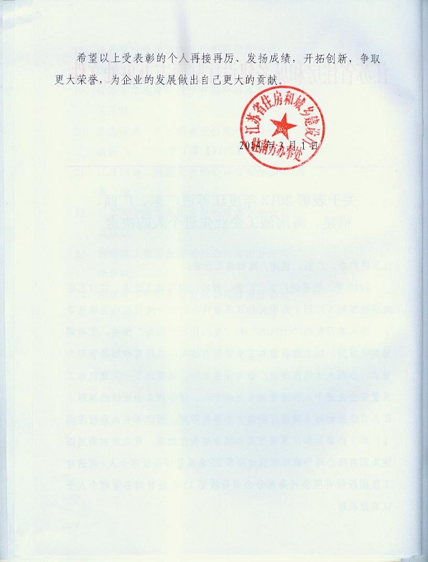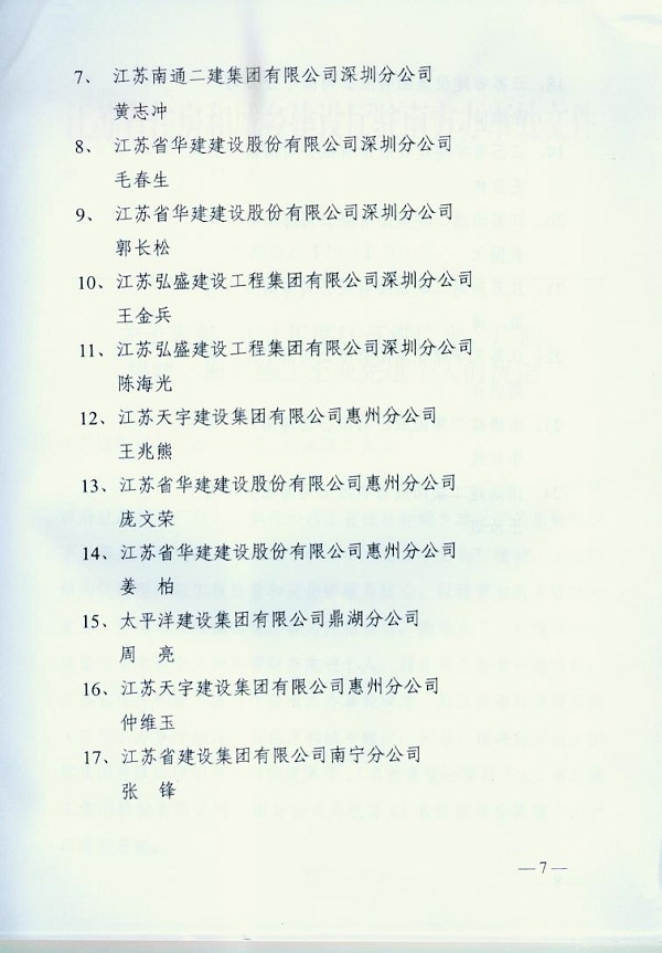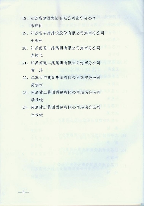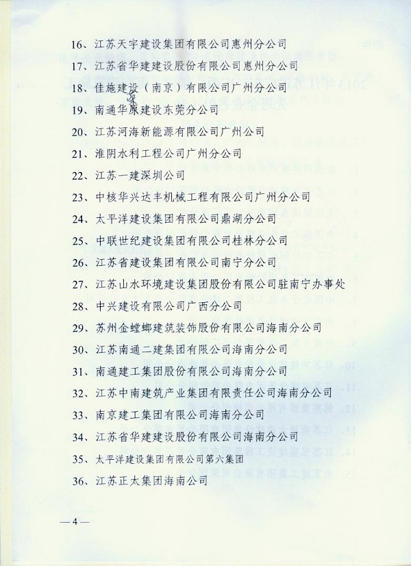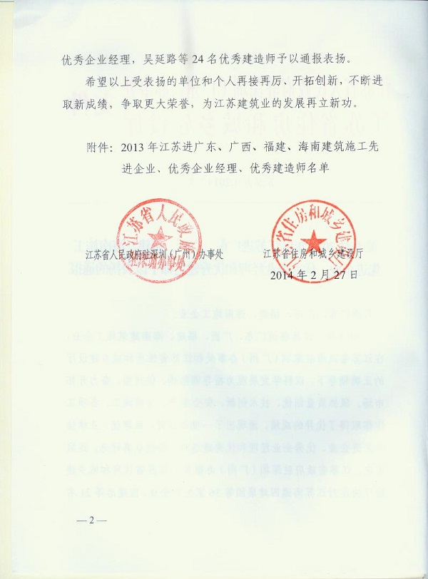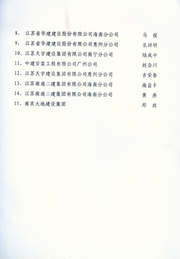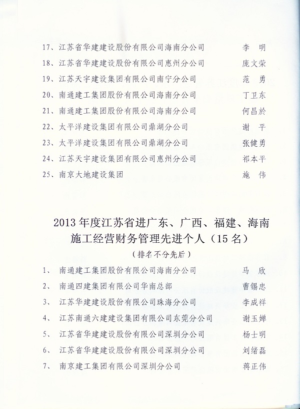 2013年江蘇進粵、桂、閩、瓊建筑施工先進企業、優秀企業經理、優秀建造師及經營財務管理、質量安全管理先進個人