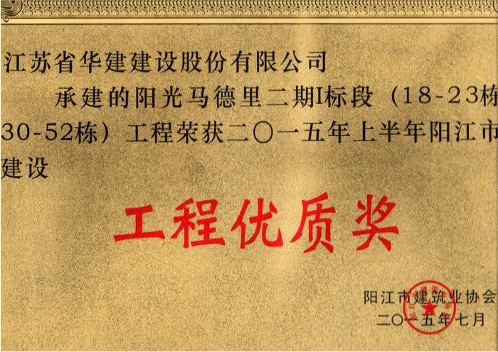陽光馬德里二期I標(biāo)段(18-23棟、30-52棟)工程獲 2015年上半年陽江市建設(shè)工程優(yōu)質(zhì)獎(jiǎng)