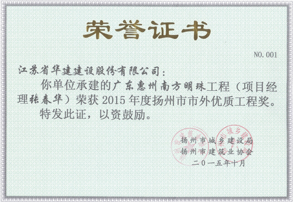 2015年揚州市市外優質工程獎2014年度市外瓊花杯-廣東惠州萬麓湖一期2013年度市外瓊...