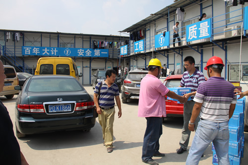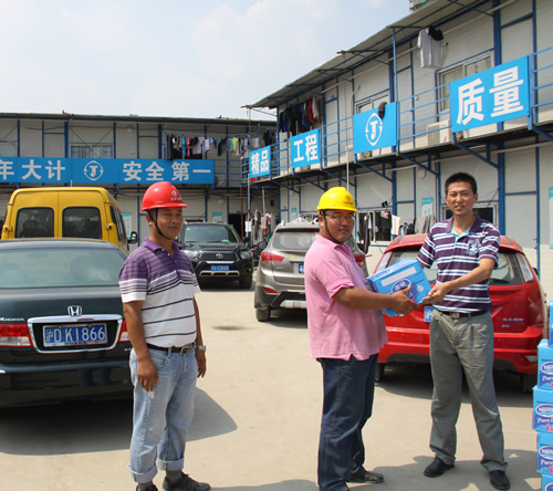 為一線員工送清涼 時間:2013-07-29 5140 驕陽似火,熱浪滾滾,持續近一個月的高溫天氣給工程正常施工帶來了很大的影響,奮戰在烈日炎炎下的一線員工的身體狀況時刻牽動著公司領導的心。7月29日,上海室外溫度更是超過40度,江蘇華建副總經理、上海分公司總經理楊杰特地委托總工程師魏春明、工會副主席陳德權等同志赴由公司承建的上海楓葉國際學校工地看望一線作業人員,為員工送去了礦泉水、毛巾等清涼慰問品,并叮囑要注意避開高溫作業時段,保護身體,確保夏季施工生產安全。