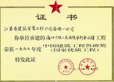 海口市中級(jí)人民法院審判辦公樓位于海口市金宇路8號(hào),1995年4月竣工,1996年6月被評(píng)為海南省優(yōu)質(zhì)工程,并榮獲海南省優(yōu)秀建筑二等獎(jiǎng),1997年12月榮獲1997年度建筑工程魯班獎(jiǎng)。