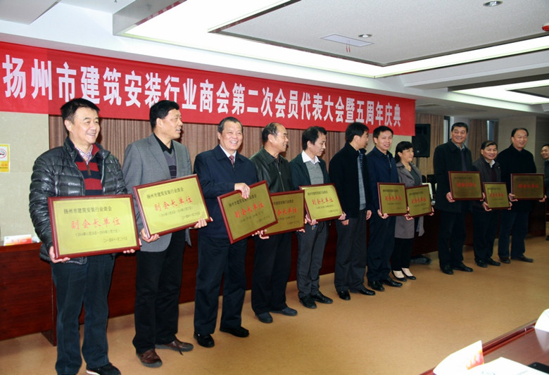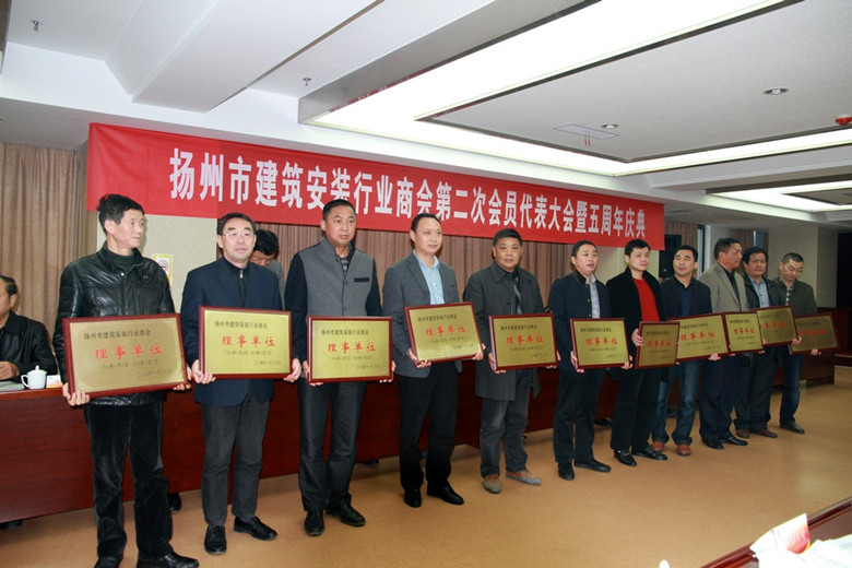 1128日,揚州市建筑安裝行業商會在高郵市隆重召開第二次會員代表大會暨成立五周年慶典活動,46家會員企業代表參加,揚州市人大副主任、市工商聯主席、總商會會長孫永如,市委統戰部副部長、揚州市工商聯黨組書記、總商會黨委書記趙振東,市工商聯、總商會秘書長劉俊,市民政局社團管理處處長張紹華等出席會議,市房地產商會、建筑業協會等兄弟友好商會會長列席會議。