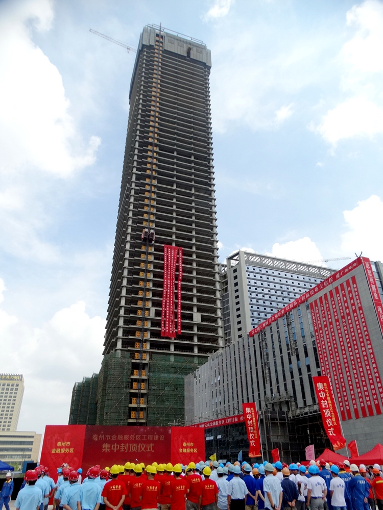 泰州金融服務(wù)區(qū)項(xiàng)目是泰州重點(diǎn)工程項(xiàng)目,共20幢樓宇、70多萬(wàn)平米總面積,是泰州建市以來(lái)投資總量最多、單體建筑規(guī)模最大的建筑群。江蘇華建在泰州金融服務(wù)區(qū)共承包了10幢大樓的施工任務(wù),施工標(biāo)段的總面積約27.9萬(wàn)平方米。其中:6號(hào)樓主樓58層,為超高建筑,設(shè)計(jì)高度為248米,裙樓7層,主樓裙樓總建筑面積約115900平方米。這一蘇中第一高樓,不僅是泰州地區(qū)第一棟主體為鋼筋混凝土核心筒+外框鋼結(jié)構(gòu)形式的超高層建筑,而且在蘇中地區(qū)也是單體鋼結(jié)構(gòu)高度最高的建筑,用鋼量多達(dá)8000噸。其將在130米高空建設(shè)空中游泳池,同時(shí)在230米的高度,建設(shè)空中旋轉(zhuǎn)餐廳。