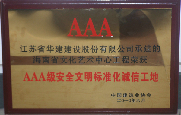 “海南省文化藝術中心”項目榮膺全國AAA級安全文明標準化誠信工地 時間:2010-07-24 5417 近日,經中國建筑業協會建筑安全分會在專家評審、組織抽查和網上公示,海南公司承建的海南省文化藝術中心工程榮膺全國“AAA級安全文明標準化誠信工地”,這是海南公司近年來首次獲得此項榮譽。 該項目自開工以來,以摘取魯班獎為最高質量目標,積極策劃,精心組織,以過程創精品,狠抓細部施工,各項指標始終處于受控狀態,多次接受省、市領導、專家、同行的現場觀摩,獲得業內高度評價。