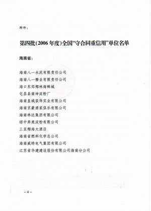 企業誠信榮譽 時間:2019-01-01 9019 2001-2002年度海口市守合同重信用 2003-2004年度??谑惺睾贤匦庞?/FONT> 2005-2006年度??谑惺睾贤匦庞?nbsp; 2002-2004年度海南省守合同重信用 2006年度全國守合同重信用1 2006年度全國守合同重信用2 2006年度全國守合同重信用3 2006年度全國守合同重信用4 2012年度海南省守合同重信用